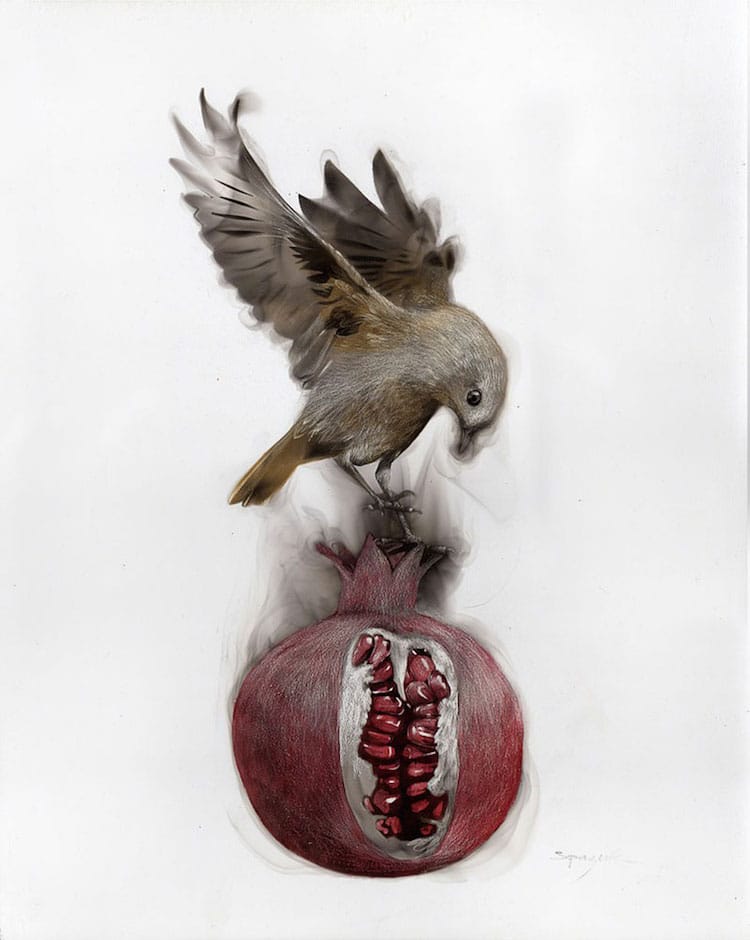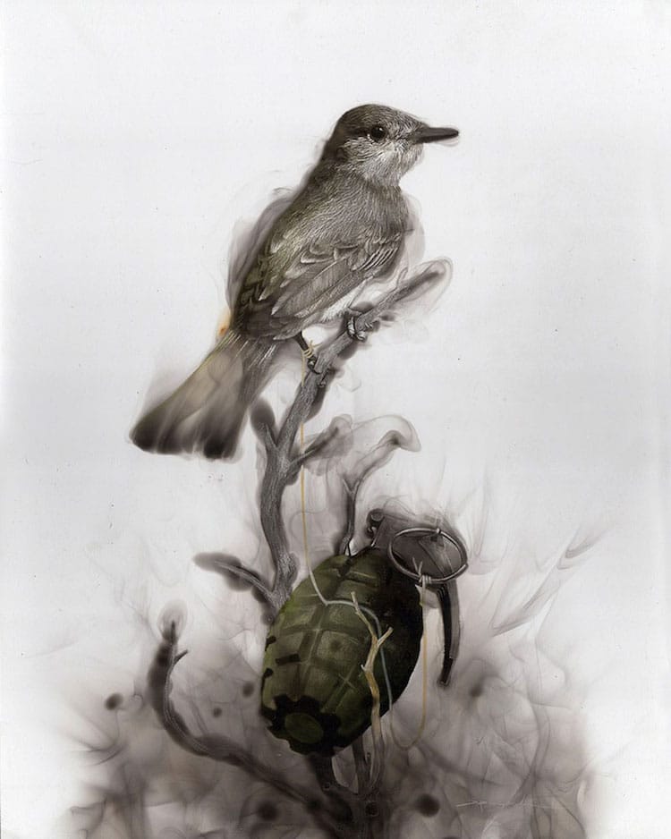 His newest work was exhibited in the Boston Adelson gallery, London. He shaped the faire fumes from different tools to convey how fragile life is. As he says that fire consumes, warms and illuminates and can bring pain and death.The symbolic meaning of fire varies in a very broad way. So the artist focuses on the imagery of fragile things like birds and feathers,as his soul of art is exploring the fragility of life with his fumage technique.