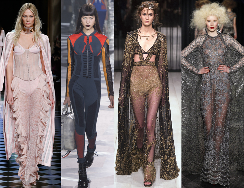 The suit was revealed from beneath a sweeping cape and was also exhibited in the MET’S exhibition, displayed just beside Robert Downey Jr’s Iron Man costume. Mughler’s comic influence can be seen in the catwalks of moulded bodices of iconic villains and heroes looks, bodysuits featuring flames , starbursts and metal belts, extravagant padding and latex leggings. Mughler’s approach towards his design was very different as this armour was incapable of protecting the wearer’s breasts, stomach, or thighs. His unique style of collaborating the comics world to fashion created a different space for him, from where he could be easily differentiated by others.
