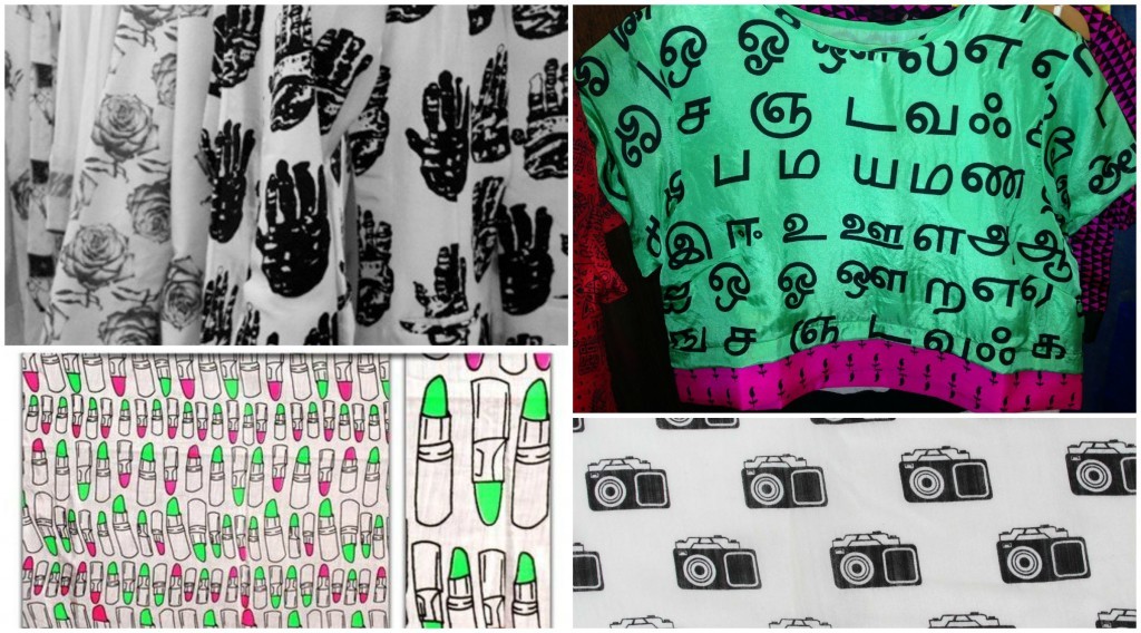 Few of her trendy and famous works are lipstick print, palm and camera prints, telephone booth, table top fan prints, stripes prints, different textures, hand prints, black and white ink drip prints. Her common motifs are check, straps, floral prints, animal prints, taps, scissors and glass of water.