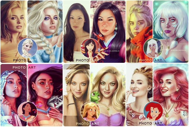 From Emma Stone as Merida to Billie Eillish as Kida Nedakh , Helen definitely gave Hollywood some ideas to consider . It’s clear that the artist carefully studies not only the physical features of the celebrities but also uses her imagination to transfer them to a Disney character and identifies the personalities of each celebrity before “assigning ” them their Disney character .